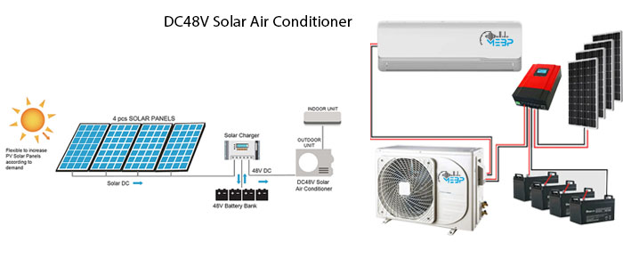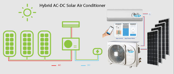 تهویه هوای خورشیدی هیبرید AC/DC، با تهویه هوای اینورتر DC متفاوت میباشد. این محصول در طول روز، مستقیما با برق DC که از پنلهای خورشیدی تولید میشود، کار میکند. با تکنولوژی مدیریت برق هوشمند، این سیستم میتواند به طور مستقیم از برق DC از پنلهای خورشیدی استفاده کند و دیگر نیازی به اینورتر، باتری و یا کنترل کننده ندارد. در طول یک روز آفتابی، هنگامی که برق تولید شده خورشیدی بیشتر از مصرف برق دستگاه تهویه هوا باشد؛ این دستگاه هیبریدی میتواند بیشترین برق را از پنلهای خورشیدی با کارایی بالاتر از شاخص SEER21 بگیرد. این دستگاه را میتوان با برق DC خورشیدی تا 380v/10A متصل کرد. این سیستم که برق مورد نیاز را در طول ساعتهای آقتابی با استفاده از خورشید محیا میکند، برای کاربرد هیبریدی طراحی شده است. این سیستم در درجه اول از انرژی خورشیدی استفاده میکند و در صورت نیاز آن را با برق معمولی 220v-240v AC ترکیب میکند. واحد داخلی و خارجی دستگاه تهویه هوا تا حد زیادی اتلاف انرژی را کاهش میدهند و صدای کم را تضمین میکنند.